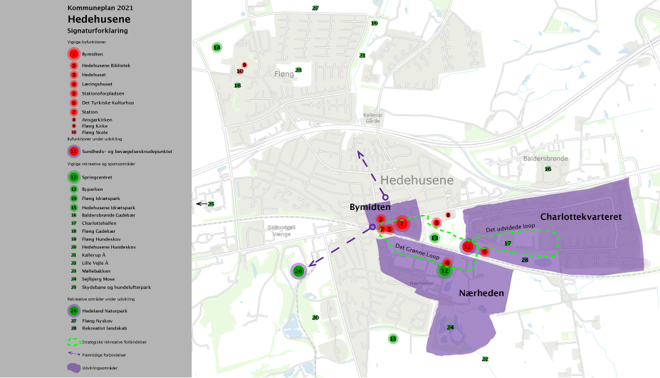 - Det Grønne Loop og dets udvidelse skal sammen med øvrige stier forbinde Hedehusenes forskellige kernefunktioner som handel, station, uddannelse, sport og kultur. Kernefunktionerne indgår som en del af Hedehusenes offentlige rum og skaber plads til borgernes fælles udfoldelseskraft