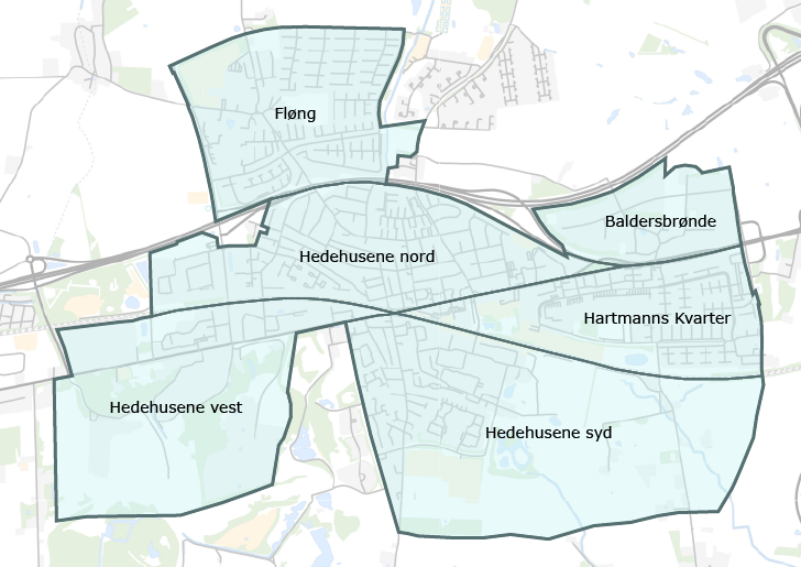 Hedehusene er en sammensmeltning af stationsby og omkringliggende landsbyer. Byen består overordnet af 6 kvarterer: Hedehusene vest, syd og nord, samt Hartmanns Kvarter, Baldersbrønde og Fløng. Hedehusene vest og nord fortæller historien om den industrielle by med blandt andet tidligere arbejderboliger fra 1800-tallet. Øst for er der vokset et industrikvarter op omkring landsbyen Baldersbrønde. Nord for Holbækmotorvejen er landsbyen Fløng udbygget med parcelhuse, grønne områder og institutioner. Hedehusenes bymidte fordeler sig gennem Det Grønne Loop i Hartmanns Kvarter og Hedehusene syd. Det Grønne Loop løber igennem Hovedgaden, byparken under jernbanen til Nærheden i Hedehusene syd og forbinder til broen og tilbage til Hovedgaden og stationen. I Hovedgaden findes detailhandel, bibliotek og restauranter og i byparken rekreative områder og kulturhuset Hedehuset. I parkens forlængelse findes kirken, Hedehusene Idrætscenter, det tyrkiske kulturhus, og i den nye bydel Nærheden ligger springcentret, byens skole Læringshuset og en dagligvarebutik. Nærheden forventes udbygget i 2025 med i alt 2.700 boliger. Den vestlige del af Hartmanns Kvarter udgøres af etage- og rækkehuse samt parceller. I den sydvestlige del af Hedehusene syd ligger et parcelhuskvarter og Hedehusene Idrætspark.