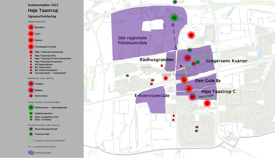 - Udvikling af byen som regionalt mødested med fyrtårnsattraktioner, som parkstrøget i Høje Taastrup C med verdens længste skaterbane og Det regionale Fritidsområde, der tiltrækker gæster fra hele regionen